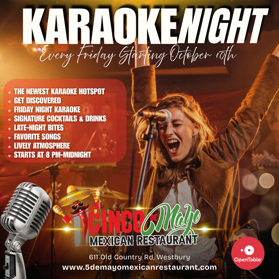 Get ready to unleash your inner star — KARAOKE NIGHT is here! Starting October 10th, every Friday from 8 PM–Midnight, Cinco De Mayo Mexican Restaurant transforms into Long Island’s newest karaoke hotspot. Enjoy signature cocktails and late-night bites, and get discovered. Your Fridays just got a whole lot more fun!
